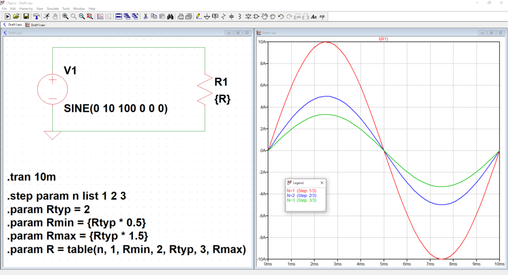 例えば、以下のような回路で抵抗値をセンター値から±〇%としたときの値を指定したい。しかし”.step param R list 1 2 3″というように数字で入れるのは面倒くさい。変数名を入れたいな。と。